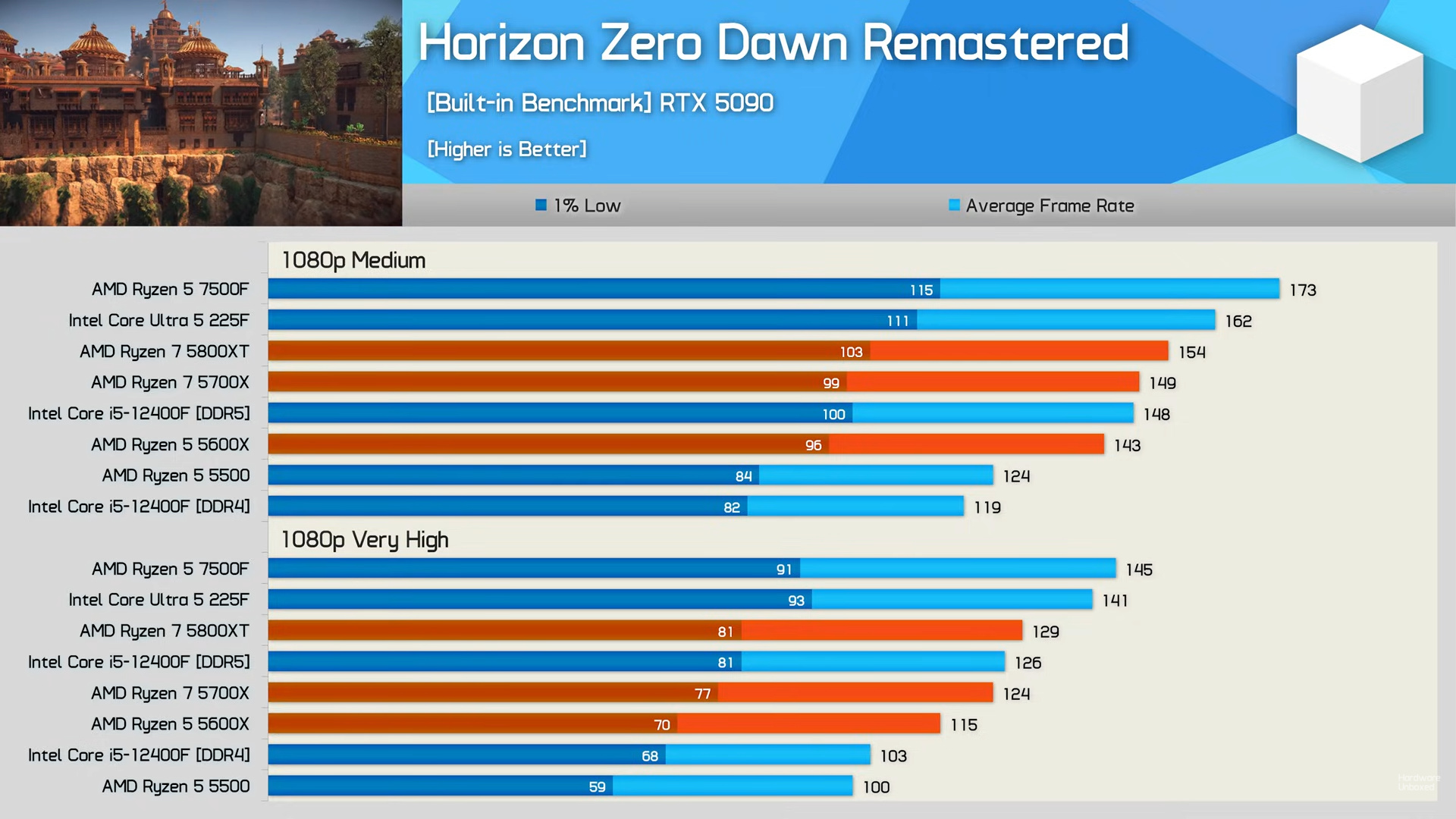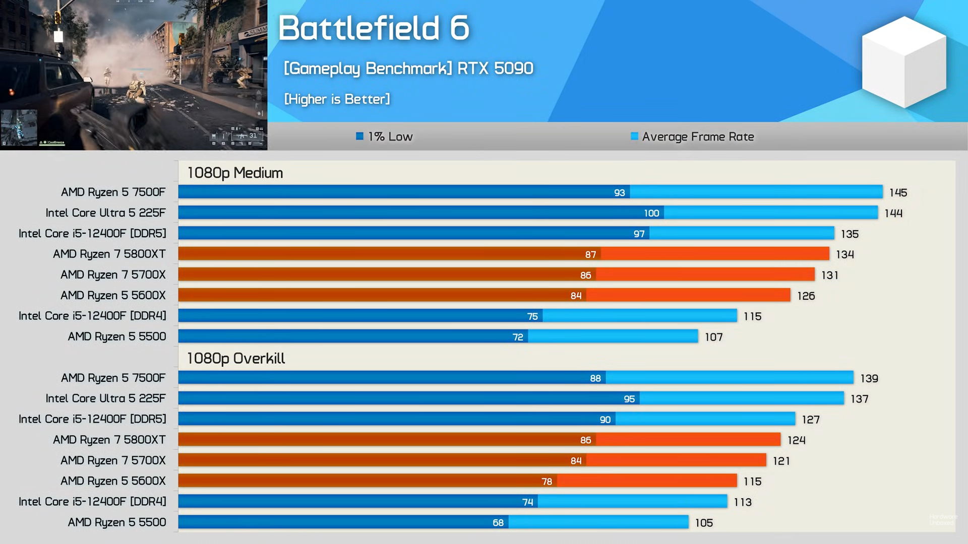 И, как оказалось, в свежей Windows 11 получили прирост производительности не только новые процессоры на микроархитектуре Zen 4 и Zen 5, но и старые Zen 3, которые в их тестировании были представлены моделями Ryzen 5 5500, Ryzen 5 5600X, Ryzen 7 5700X и Ryzen 7 5800XT. Давайте посмотрим на результаты, получившиеся у издания Hardware Unboxed в довольно большом количестве свежих игр. Они сравнили их в разрешении Full HD с видеокартой GeForce RTX 5090 на средних и ультра настройках графики.