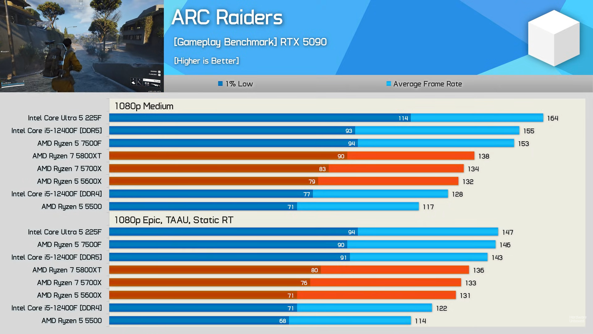 Похожая картина и в Arc Raiders, Core i5-12400F с оперативной памятью DDR4 и Ryzen 5 5600X очень близки по производительности.