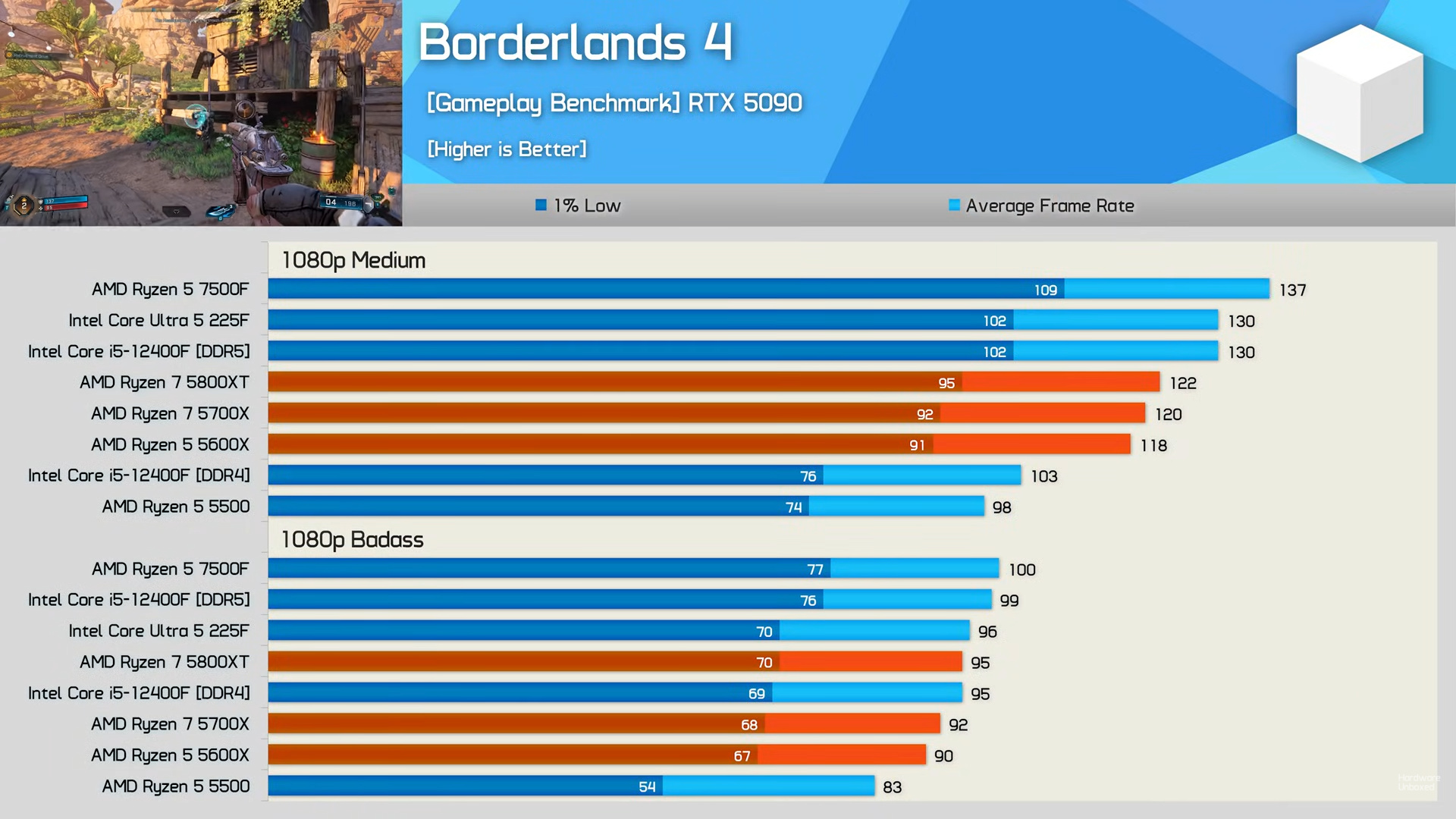 Что интересно, так это то, что в Borderlands 4 Core i5-12400F с оперативной памятью DDR5 умудрился обогнать даже Core Ultra 225F. Да, новинки от Intel хоть и энергоэффективны, но производительностью не блещут.