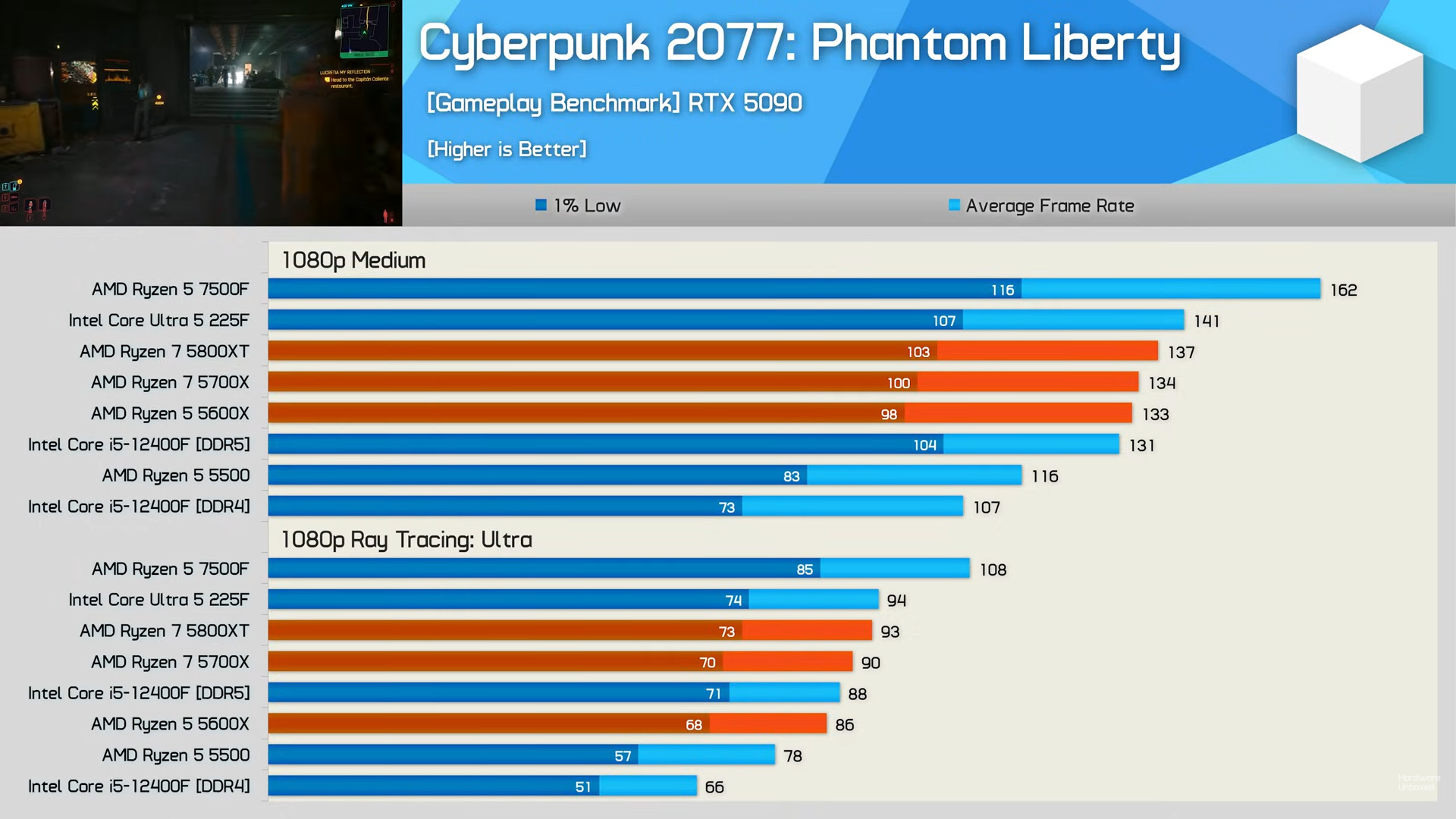 В требовательной игре Cyberpunk 2077: Phantom Liberty процессор Core i5-12400F с оперативной памятью DDR4 заметно уступил Ryzen 5 5600X.