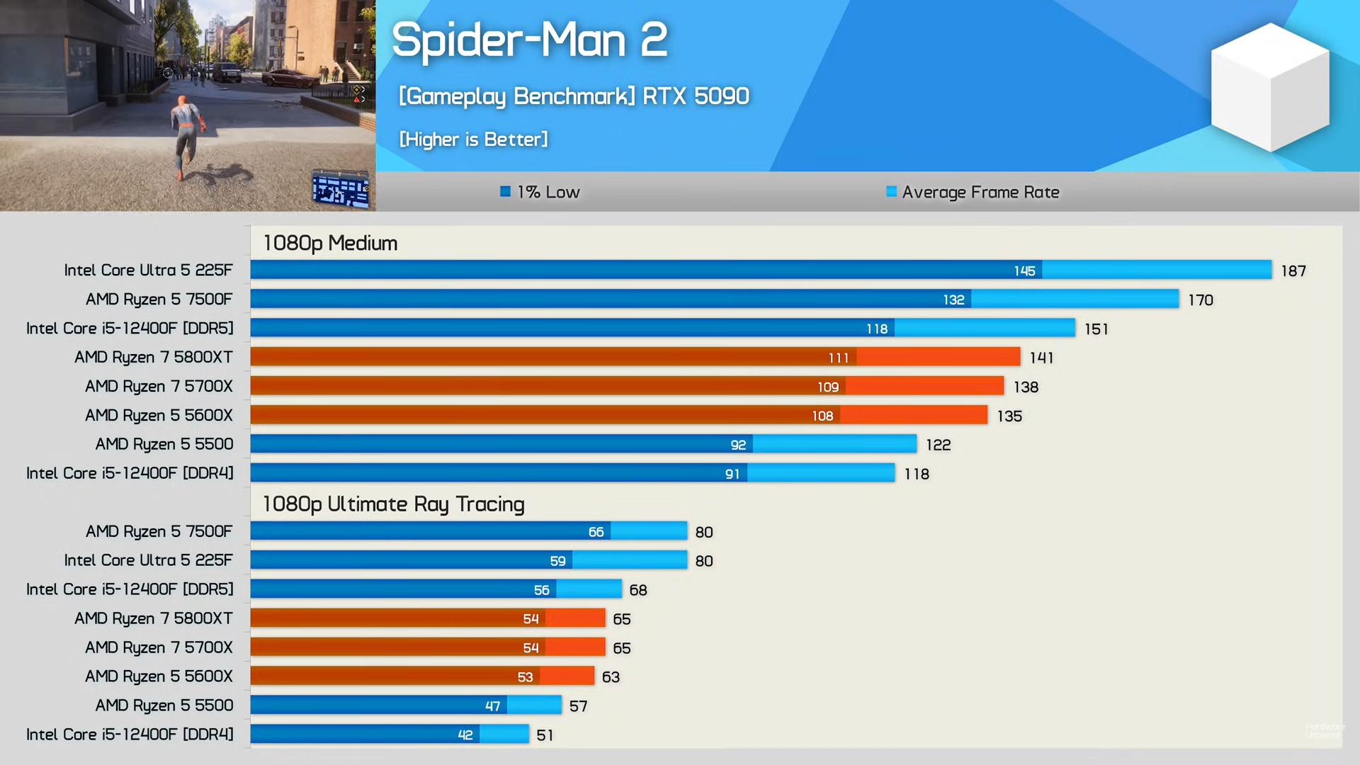 Заметный разрыв между Ryzen 5 5600X и Core i5-12400F с ОЗУ DDR4 и в игре Spider-Man 2.