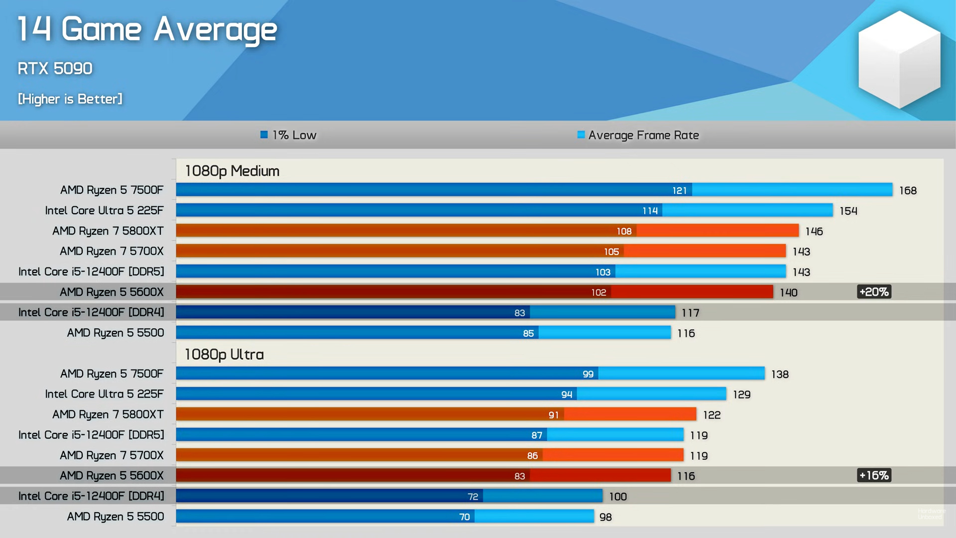 Подводя итоги, мы видим, что Ryzen 5 5600X обошел Core i5-12400F, работающий с оперативной памятью DDR4, на 20% в играх со средними настройками графики. Почти догнав Core i5-12400F в конфигурации с DDR5. На ультра настройках графики разрыв между Ryzen 5 5600X и Core i5-12400F с ОЗУ DDR4 уже меньше — 16%, но все равно довольно заметный.