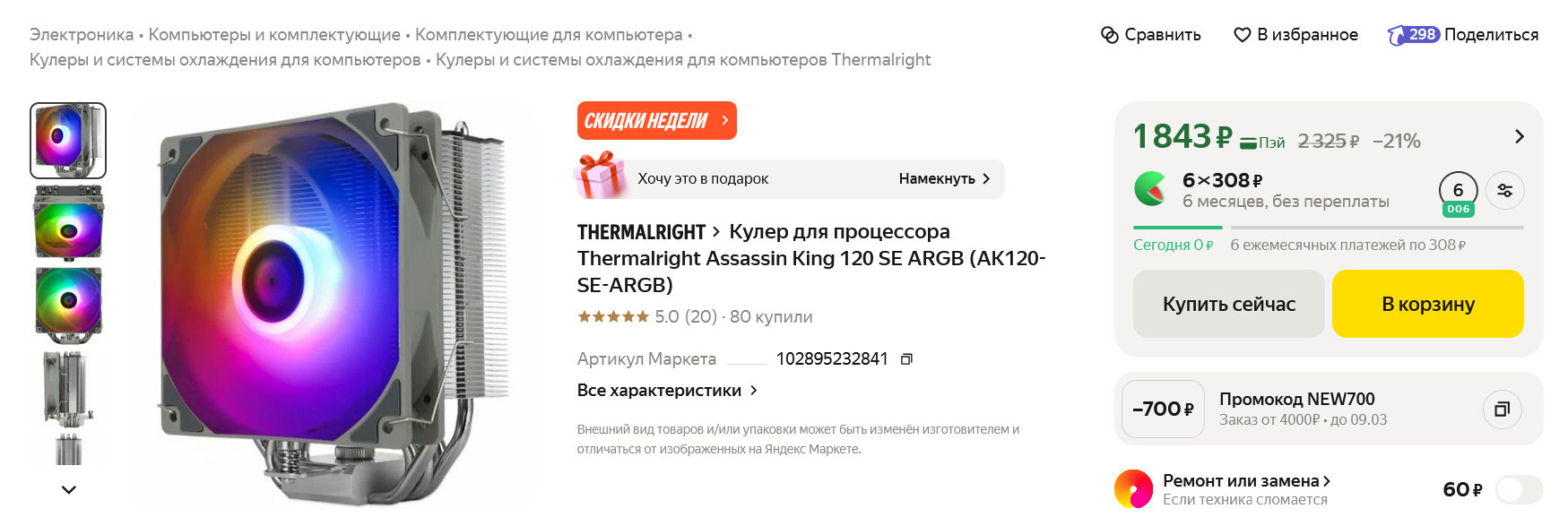 Энергопотребление в 115 ватт — это, конечно, не те 180 ватт, что ест, вернее, не ест, а «жрет» Core i5-14600K, но и не те скромные 76 ватт, что потребляет Ryzen 5 5600. Поэтому самый дешевый кулер с вентилятором-«стодвадцаткой» быстро заставит вас пожалеть о том, что сэкономили на охлаждении 1000 рублей. Нам понадобится кулер производительнее, чтобы в играх вентилятор на нем не ревел, а температуры вас не пугали. Например, Thermalright Assassin King 120 SE ARGB (AK120-SE-ARGB) с пятью теплотрубками и максимальной рассеиваемой мощностью в 200 ватт.