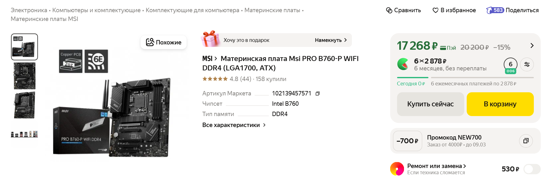 Еще летом прошлого года геймера, выбирающего мощный процессор и ОЗУ DDR4, засмеяли бы на форумах и в комментариях. Но сегодня другого выхода нет, так как гораздо выгоднее вложить разницу в стоимости между ОЗУ DDR4 и DDR5 в видеокарту, получив гораздо больше производительности. Поэтому в нашу сборку сегодня мы возьмем отличную материнскую плату MSI PRO B760-P WIFI DDR4.