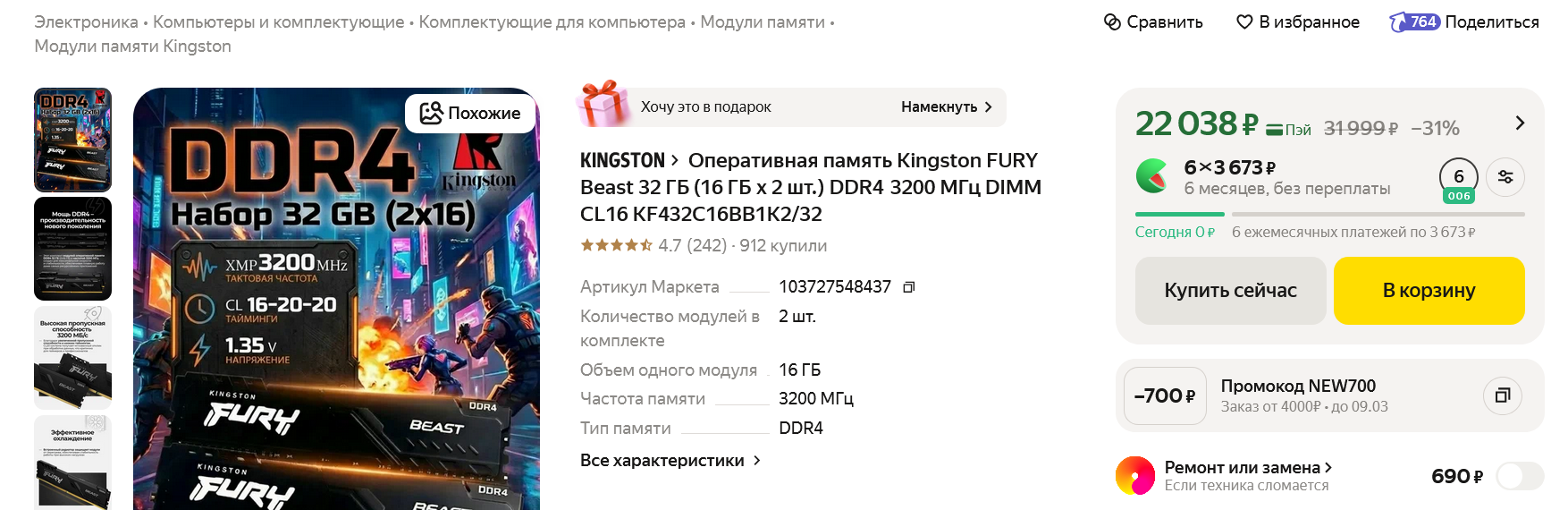 Не стоит надеяться компенсировать низкую скорость ОЗУ DDR4 ее более высокой частотой. Модули с частотами 3600 МГц, не говоря уже о более быстрых, стоят так дорого, что будет проще доплатить еще немного и собрать игровой ПК на базе ОЗУ DDR5, тем более что процессоры для платформы AM5 сильно подешевели. Поэтому в нашей сборке будут стоять не самые быстрые, но оптимальные по цене модули Kingston FURY Beast KF432C16BB1K2/32 с частотой 3200 МГц и таймингами 16-20-20-32. А их общий объем будет, конечно же, 32 ГБ, брать сегодня ОЗУ объемом 16 ГБ можно только в самые бюджетные сборки.