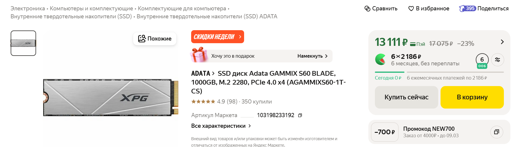 С высокими ценами на SSD многим придется пересмотреть способ использования накопителя и устанавливать только те игры, которые нужны именно сейчас. В таком режиме большинству геймеров вполне хватит объема SSD в 1 ТБ для игр, Windows и личных файлов. А вот на качестве экономить не стоит, поэтому мы возьмем надежный и быстрый SSD Adata GAMMIX S60 BLADE (AGAMMIXS60-1T-CS).