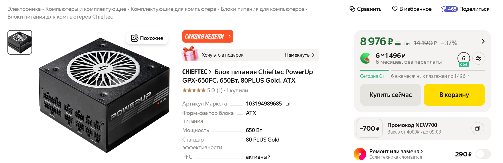 А еще не стоит забывать о надежности — если бюджетный блок питания может годами без проблем работать в экономичном офисном ПК, практически не греясь, то геймерская сборка с высоким энергопотреблением — это совсем другие условия работы. Поэтому мы возьмем качественную и надежную модель, с современной схемотехникой и надежными конденсаторами — Chieftec PowerUp GPX-650FC мощностью 650 ватт. Полностью модульный, с сертификатом 80 PLUS Gold, мостовым LLC-преобразователем, работающим по технологии DC-DC. Технологии защиты защиты, применяемые в этой модели — OCP, OPP, OTP, UVP, OVP, SCP и SIP.