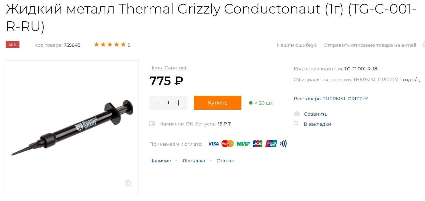 Возьму недорогой, для примера, Thermal Grizzly Conductonaut. 775 руб плюс доставка, 975 руб!