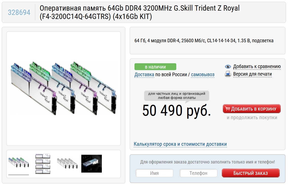 При выборе оперативной памяти мне попалась G.Skill Trident Z Royal объемом 64 ГБ, которая не только имеет отличные характеристики, но и шикарно выглядит. Однозначно беру сразу два комплекта, ведь у нас сокет 2066!