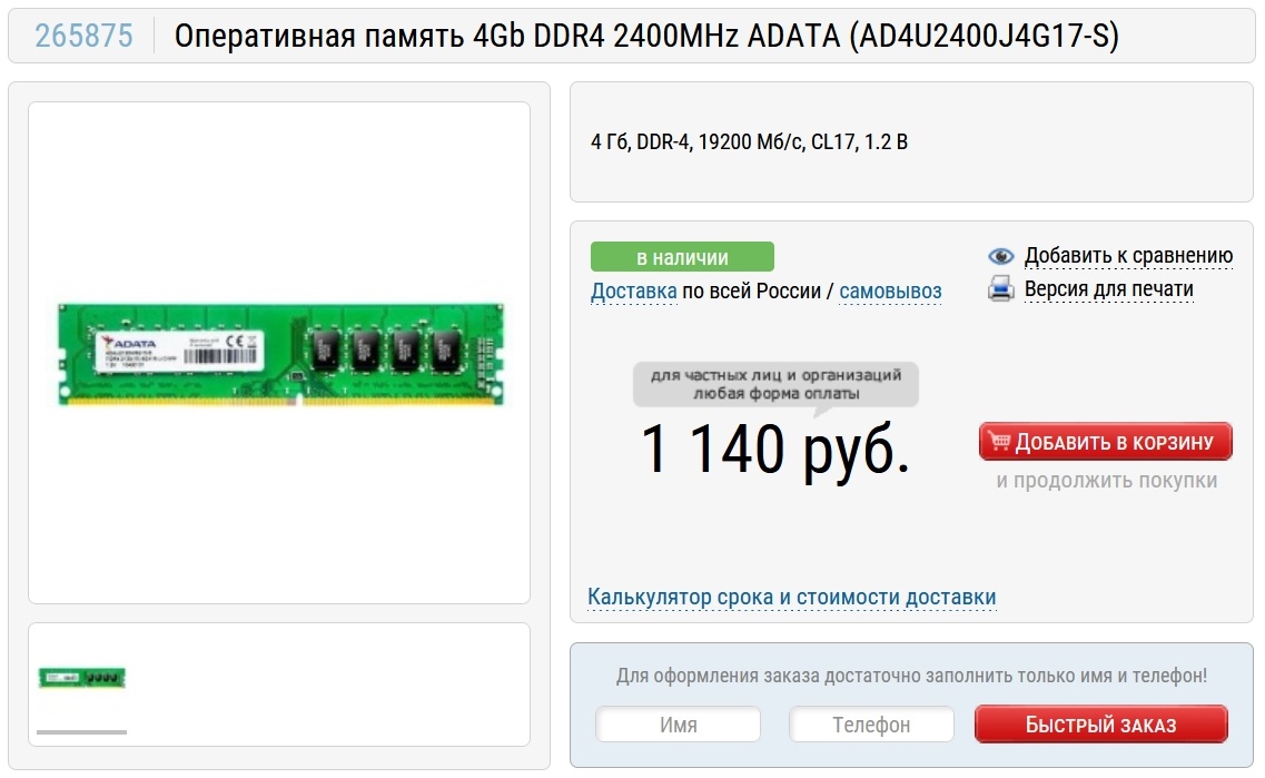Оперативная память будет одной планкой. 4 ГБ DDR4 ADATA (AD4U2400J4G17-S).