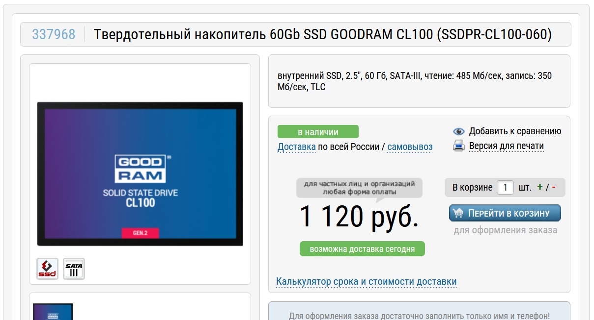 Накопитель в сборке будет SSD GOODRAM CL100 (SSDPR-CL100-060).