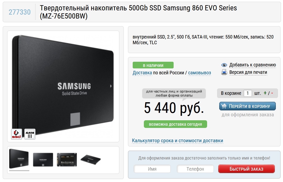 Осталось выбрать накопители, и с ними я решил не экономить. В качестве системного диска будет SSD Samsung 860 EVO Series (MZ-76E500BW), емкостью 500 ГБ. Этот SSD не нуждается в представлении, надежный и производительный, не теряющий скорости при длительных нагрузках.