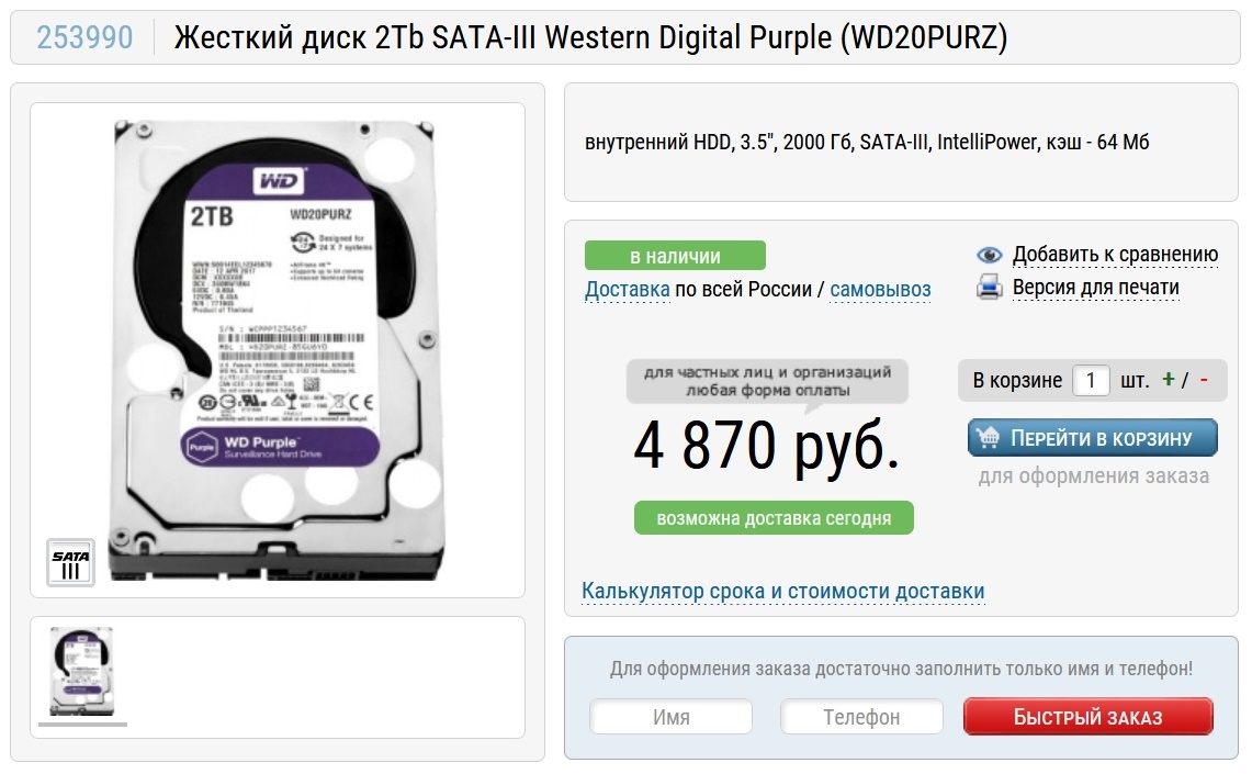 А как накопитель для "холодных" данных или, по-простому - "файлопомойка", будет жесткий диск Western Digital Purple (WD20PURZ) объемом 2 ТБ. Он довольно дорогой, но отличается тихой работой и неплохой надежностью.