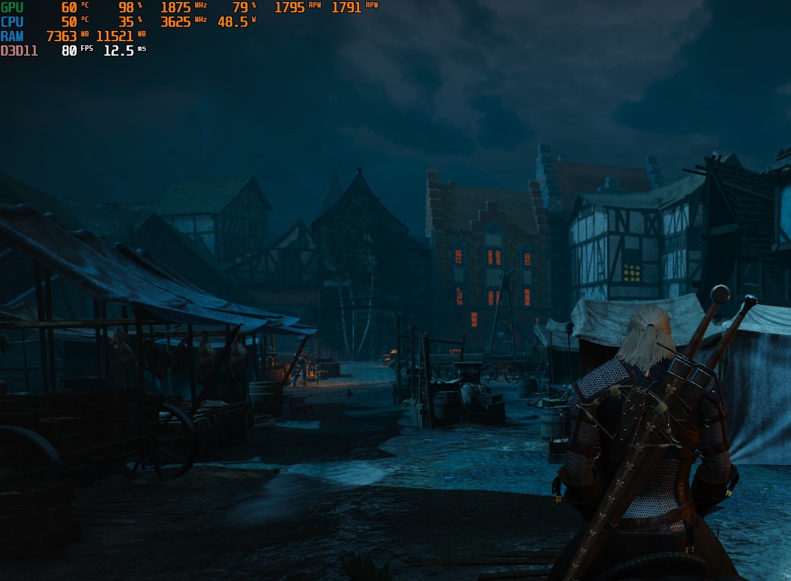 Всего 40-50 ватт энергопотребления и загрузка 30-35%! Игра идет гладко, GeForce GTX 1660 загружается на 99% даже в Новиграде!