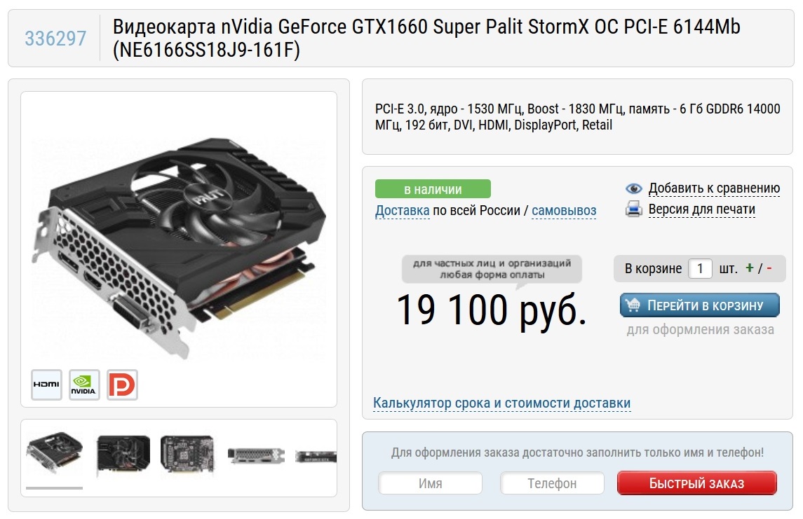 Видеокарту в эту сборку я выбрал от конкурента компании AMD - NVIDIA, GeForce GTX 1660 SUPER. Я взял самую дешевую версию от компании Palit - Palit StormX OC (NE6166SS18J9-161F). Она стоит на целую тысячу рублей дешевле аналогов, но при этом имеет кулер с теплотрубками, что вполне хватит для отвода 120 ватт тепла. Да, температуры будут немного выше, чем на дорогих моделях, но работать она будет нисколько не хуже.