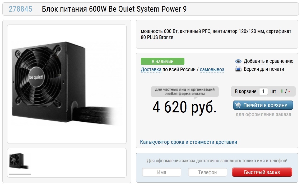 Запитывать всю эту мощь будет блок питания Be Quiet System Power 9 мощностью 600 ватт. Это неплохой и надежный блок питания. По мощности у нас будет даже запас, благодаря которому блок будет немного меньше греться и прослужит дольше.