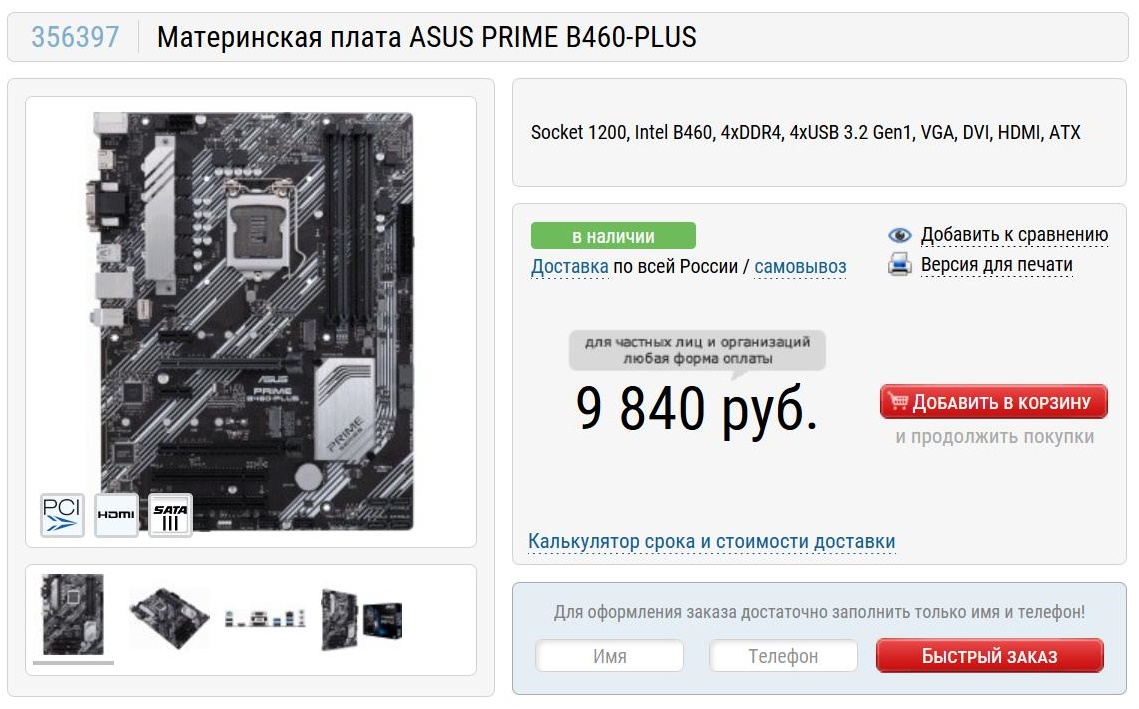 Материнская плата в нашей сборке будет ASUS PRIME B460-PLUS за 9840 рублей. Да, до цен на аналоги по оснащению на чипсете AMD B450 еще далеко, но это только старт продаж.