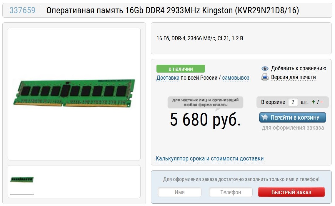 Память в нашей сборке будет Kingston (KVR29N21D8/16), два модуля по 16 Гб с частотой 2933 МГц и таймингами CL 21. На первый взгляд тайминги выглядят высокими, но нам ничто не помешает их занизить. И не забывайте, что главный плюс в этих модулях - низкая цена за объем в 32 Гб.