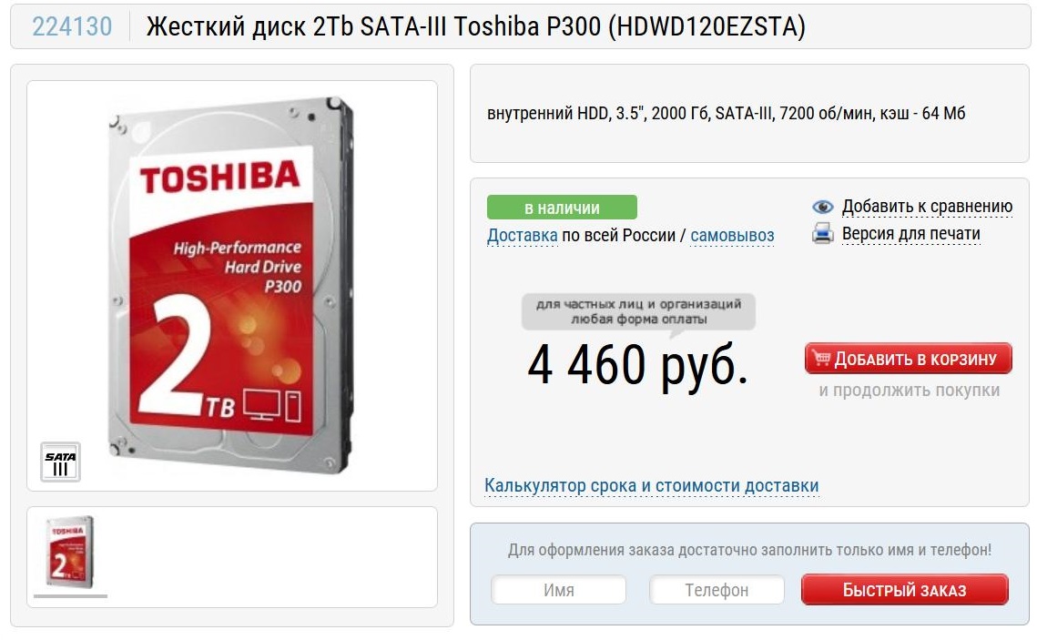 HDD в сборке будет недорогой и быстрый Toshiba P300 (HDWD120EZSTA), объемом в 2 ТБ. Такого объема вполне хватит под файлы пользователя.