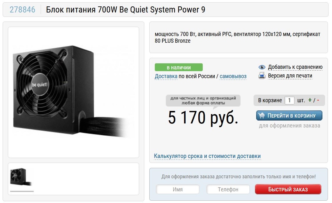 Блок питания под такое мощное железо я решил взять с запасом, и это будет Be Quiet System Power 9, мощностью 700 ватт. Меня критиковали за избыточную мощность БП в сборках, но в линейке Be Quiet System Power разница в цене между 500, 600 и 700 ваттными моделями настолько небольшая, что лучше доплатить.