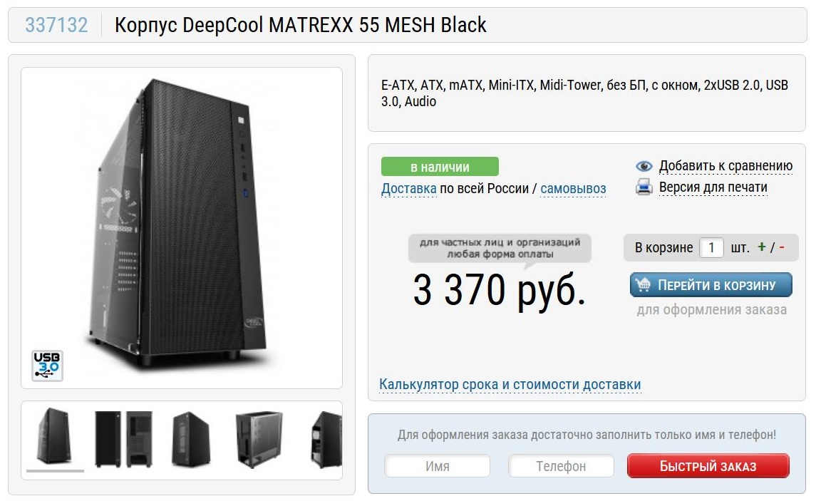 Осталось выбрать корпус и это будет вместительный и стильный DeepCool MATREXX 55 MESH Black. Он легко вместит хорошую систему охлаждения и большие комплектующие. А также он не дорог и имеет прозрачную стенку из закаленного стекла, а не из пластика.