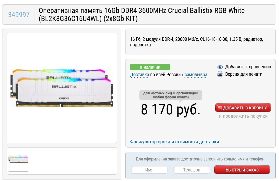 Память в нашей сборке будет Crucial Ballistix RGB White (BL2K8G36C16U4WL), два модуля по 8 Гб с частотой 3600 МГц. Память имеет приличную частоту в "стоке", а если ее разогнать, то можно достичь и частот в 4000 МГц, что заметно отразится на общей производительности системы.