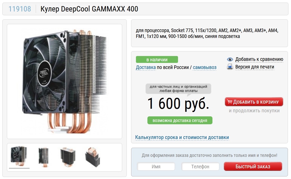Сначала я поставил в эту сборку кулер DeepCool GAMMAXX 300 R, но потом решил доплатить до его более производительного аналога DeepCool GAMMAXX 400. Ведь наш "камень" имеет 125 ватт даже без разгона и даже для небольшого разгона уже нужен производительный кулер с, как минимум, четырьмя теплотрубками.