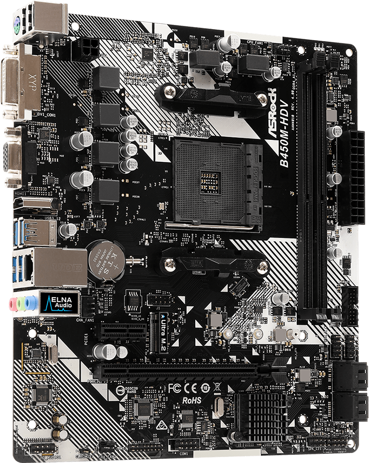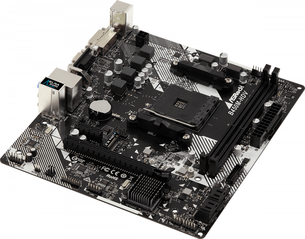 Материнскую плату для него я выбрал на чипсете B450 - ASRock B450M-HDV R4.0. Это одна из самых недорогих плат на этом чипсете, но небольшой разгон Ryzen 5 1600 и ОЗУ она вполне осилит.