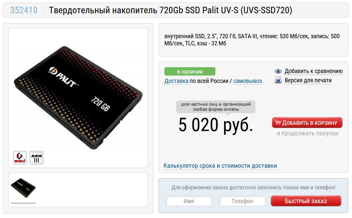 Накопитель в нашей сборке будет тоже от компании Palit - Palit UV-S (UVS-SSD720), с нестандартной емкостью в 720 Гб. Другие вендоры за эту цену предлагают SSD объемом в 480-500 Гб, так что дополнительные 220 Гб будут отличным бонусом.