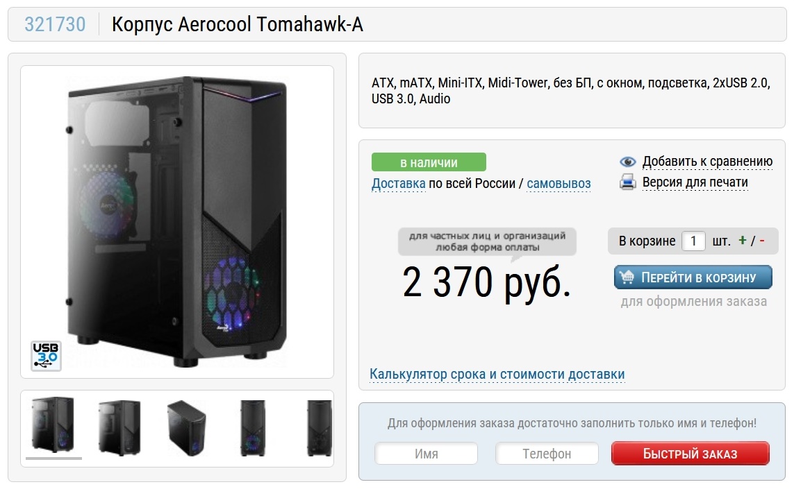 Осталось выбрать корпус и вот на нем мы сегодня немного сэкономим. Это будет Aerocool Tomahawk-A, который стоит чуть дороже 2000 рублей. Но его внешний вид вполне презентабельный, есть прозрачное окно, а продувка комплектующих будет отличной.