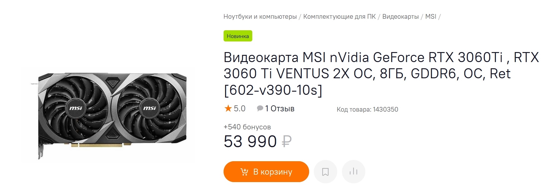 Для GeForce RTX 3060Ti рекомендованная розничная цена составляет $399 на Западе, но для России эта цифра умножилась ровно на 100, видимо, учитывая наши доходы, и рекомендованная цена видеокарты составляет 39990 рублей.