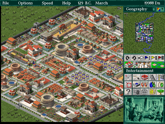Caesar III - сложная градостроительная стратегия, в которой вам предстоит отстроить город в древнеримскую эпоху, учитывая множество самых разнообразных факторов: городской бюджет, экономические ресурсы, положение города на местности, наличие или отсутствие рынков сбыта сырья и товаров. Для 1998 года игра имеет потрясающе детализированную двухмерную графику, которую многие считают венцом развития 2D-графики в стратегиях.