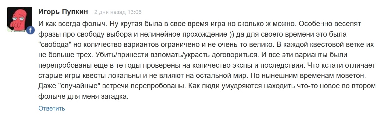 В-четвертых, память. Память подводит, слабеет, и с возрастом делает это все чаще. Если в 12 лет после прохождения Fallout 2 я помнил почти все в игре спустя год, то сейчас многое становится смутным воспоминанием и вызывает лишь чувство радостного узнавания в последний момент - "А, коготь смерти в сарае! Помню, помню". К тому же мы не занимаемся последовательным и регулярным перепрохождением старых игр по расписанию, и если учесть время, потраченное на новые игры или на периоды, когда вообще некогда или не хочется играть, то между двумя перепрохождениями может пройти и два-три-четыре года.