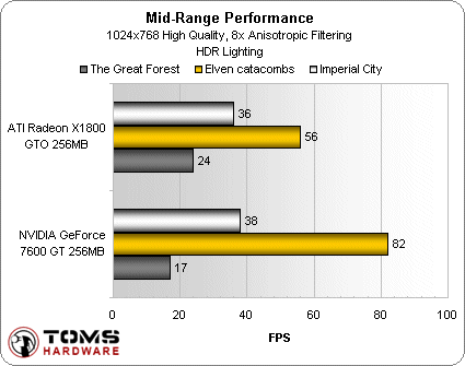 Надо заметить, что The Elder Scrolls IV: Oblivion оказался крепким орешком и для гораздо более мощных видеокарт в 2006 году. Вот такой жалкий FPS, к примеру, выдавали довольно мощные GeForce 7600 GT и Radeon X1800 GTO в разрешении 1024x768. А надо заметить, что картинка в The Elder Scrolls IV: Oblivion в формате 4:3 выглядела, мягко говоря, не очень хорошо. Создавалось ощущение, что игру уже затачивали под набирающий популярность формат 16:10 с разрешениями 1440x900 и 1680x1050.