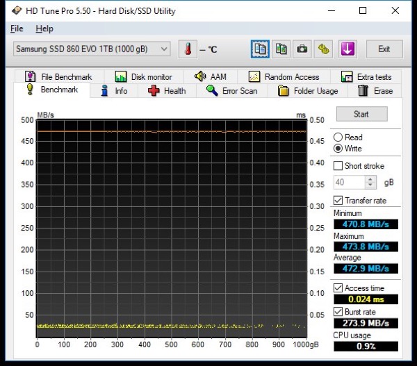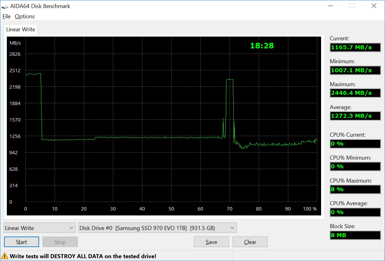 Конечно, таким скоростям далеко до скоростей SSD M.2 c интерфейсом PCI-E x4, например, Samsung 970 EVO MZ-V7E1T0BW, который выдает очень высокую скорость при записи на всем объеме, сильно выделяясь ее стабильностью и на фоне бюджетных M.2 моделей.