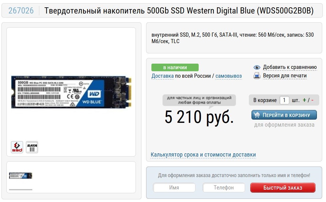 SSD Western Digital Blue (WDS500G2B0B) стоил всего 5210 рублей, а сегодня в Регарде его цена уже выше 14000 рублей! Опять в сборке попался M.2 SSD с интерфейсом SATA-III и у меня только один вопрос, на который нет ответа.