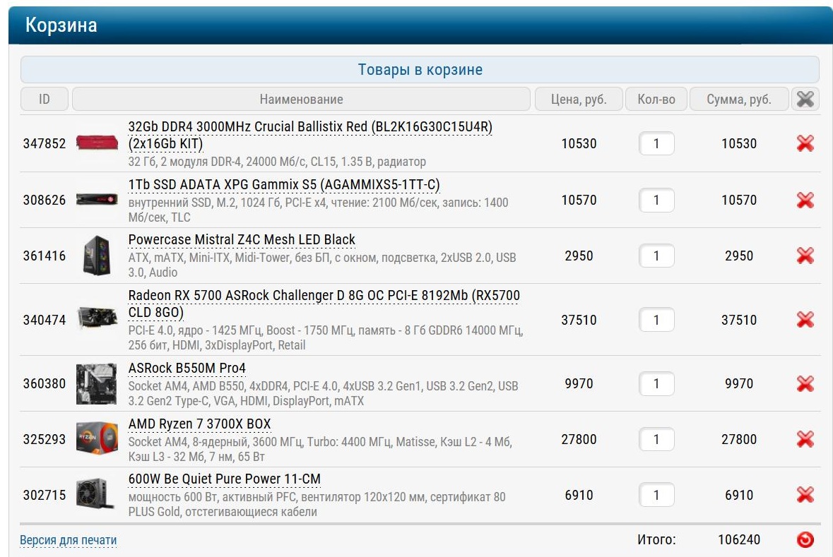 И вот итоговая калькуляция сборки, которая перевалила за 100000 рублей.