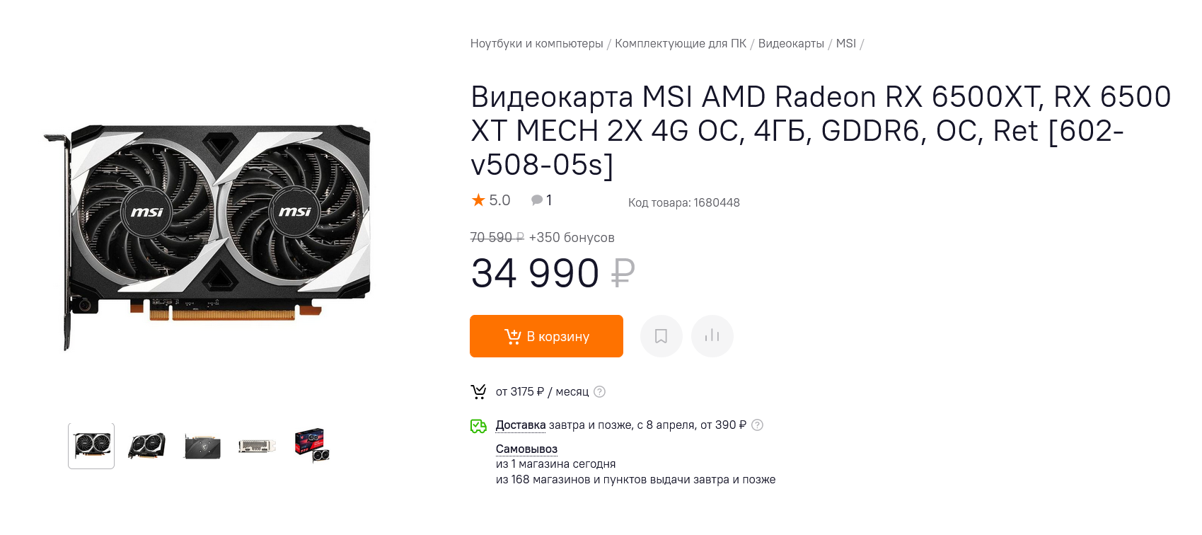 GeForce GTX 1660 даже в 2022 году может составить неплохую конкуренцию видеокартам Radeon RX 6500XT, обходя их по объему памяти и производительности в системах с PCI Express 3.0, которых на рынке большинство. А конкурировать им приходится в первую очередь из-за цен на продукцию AMD, которая снижается не так быстро, как у конкурента. Сегодня самая недорогая модель Radeon RX 6500XT в Ситилинке - MSI Radeon RX 6500 XT MECH 2X 4G OC, стоит 34990 рублей.