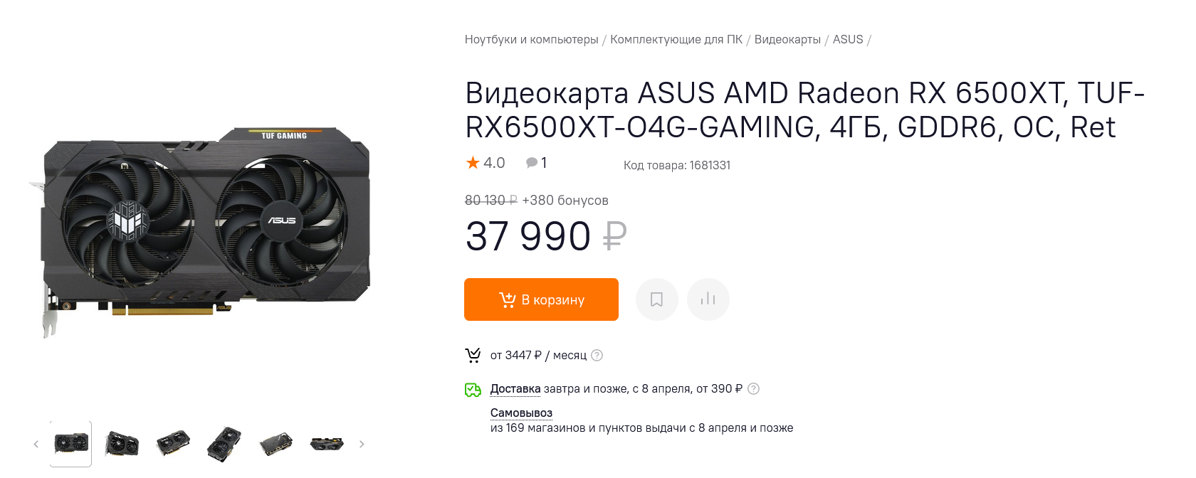 А одна из самых продвинутых моделей - ASUS TUF Gaming Radeon RX 6500 XT, стоит ненамного дешевле, чем недорогие версии GeForce GTX 1660.