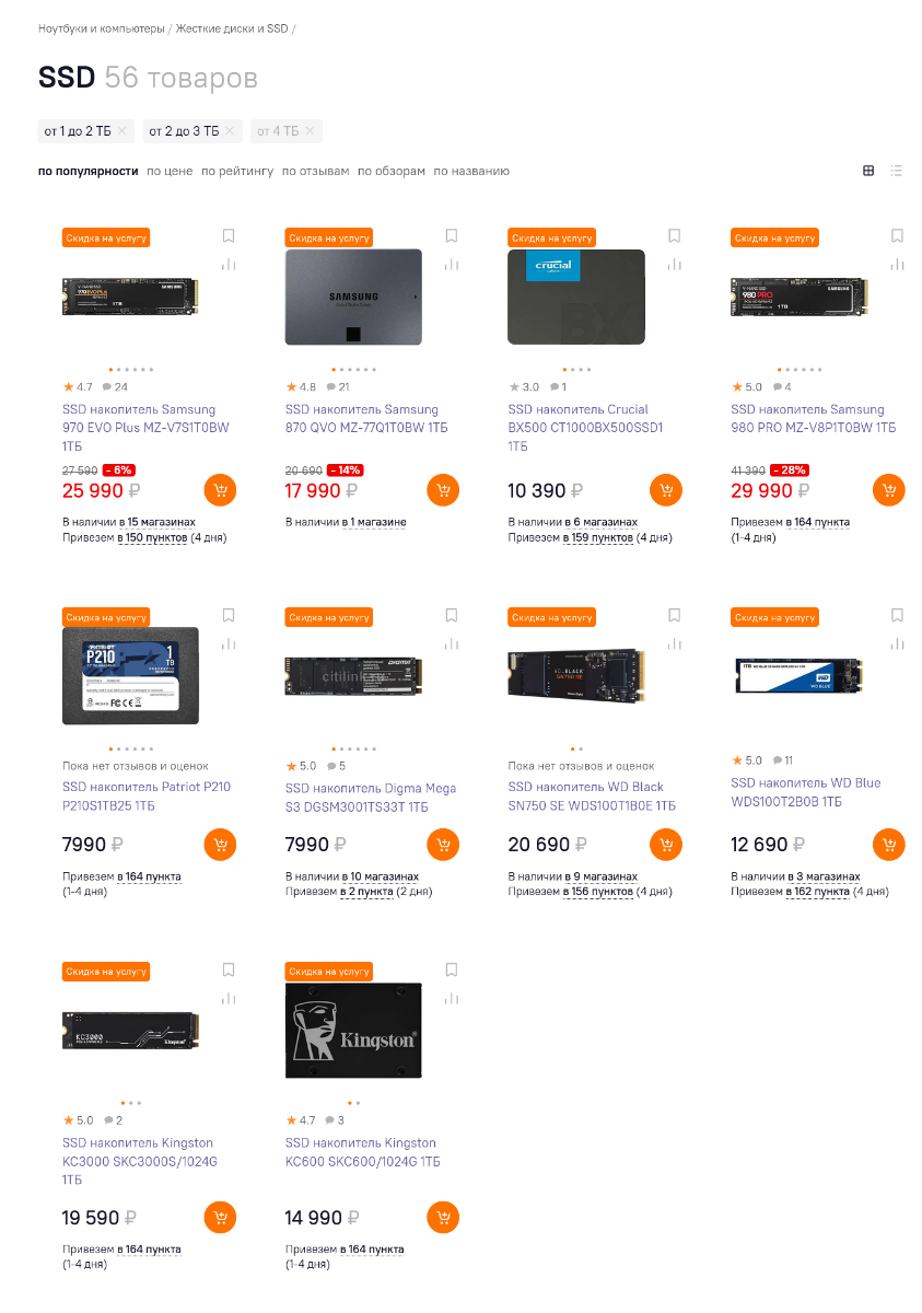 Еще один фактор популярности объемных SSD-накопителей это то, что они позволяют полностью отказаться от использования HDD в игровом ПК. Ведь если пользоваться облачными сервисами для хранения данных, смотреть фильмы и слушать музыку онлайн, то сразу становится понятно, что накопителя объемом 1 ТБ в игровом ПК хватит с лихвой и надолго. В этом блоге я предлагаю посмотреть на десятку самых популярных SSD-накопителей объемом 1 ТБ из магазина Ситилинк, взяв как модели формфактора M.2 2280, так и 2.5".
