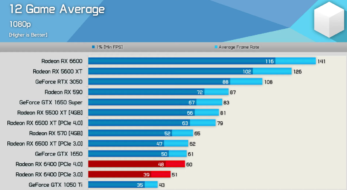 Видеокарты Radeon RX 6400 и Radeon RX 6500 XT получили очень много критики на момент выхода, но теперь, когда эмоции улеглись, пользователи взглянули на видеокарты беспристрастно. И такой взгляд показывает, что практически за цену старушки GeForce GTX 1050 Ti мы получаем почти на 20% большую производительность. Но, как и в случае с Radeon RX 6500 XT, не стоит забывать о падении производительности на системах с PCI Express 3.0.