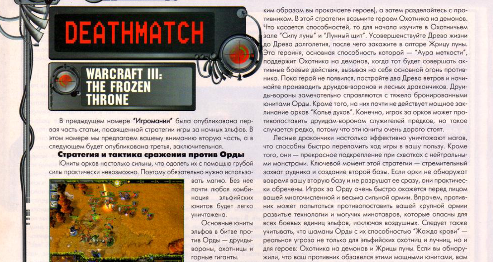 Warcraft III: The Frozen Throne была тогда стратегией номер один и на долгое время многие геймеры забыли про все остальные игры этого жанра, играя в нее не только с компьютерным противником, но и в многочисленных игровых клубах, выросших в начале нулевых как грибы после дождя. Я никогда не был мастером в игре против живого противника, но гайды из "Игромании" заметно повысили мой скилл и я стал выигрывать заметно чаще.
