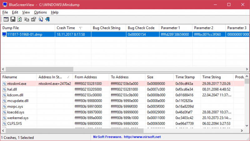 Начать стоит с одной из самых известных утилит от Nir Sofer - BlueScreenView. На форумах, посвященных проблемам с Windows, я постоянно вижу, как ее уже много лет опытные пользователи советуют тем юзерам, которых замучили синие экраны смерти - BSOD, в которые выпадает их Windows. Утилита собирает сведения из аварийных дампов памяти и отображает информацию о всех сбоях в сводной таблице, выводя массу полезной информации: о дата и времени сбоя, базовые сведения с экрана BSOD и сведения о драйвере или модуле, который привел к сбою.