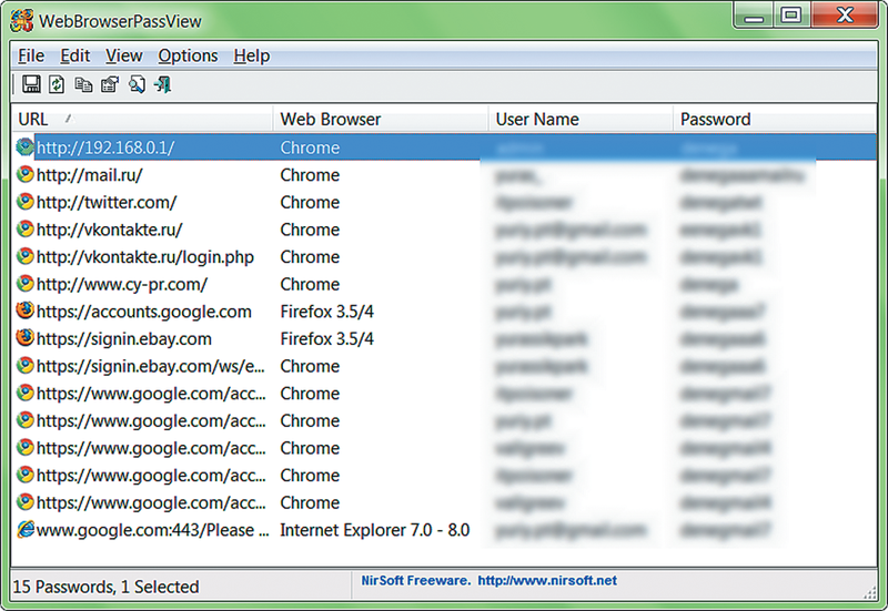 Случается ситуация, когда ваша Windows не может загрузиться после вирусного заражения или программного сбоя, а все важные логины и пароли для сайтов остались в браузере, который тоже невозможно запустить. В этом случае поможет утилита WebBrowserPassView, которая ищет логины и пароли, хранящиеся в файлах браузеров Google Chrome, Internet Explorer, Mozilla Firefox, Edge, Opera и Safari. Список найденных логинов и паролей можно экспортировать в текстовый, HTML, CSV или XML файл.