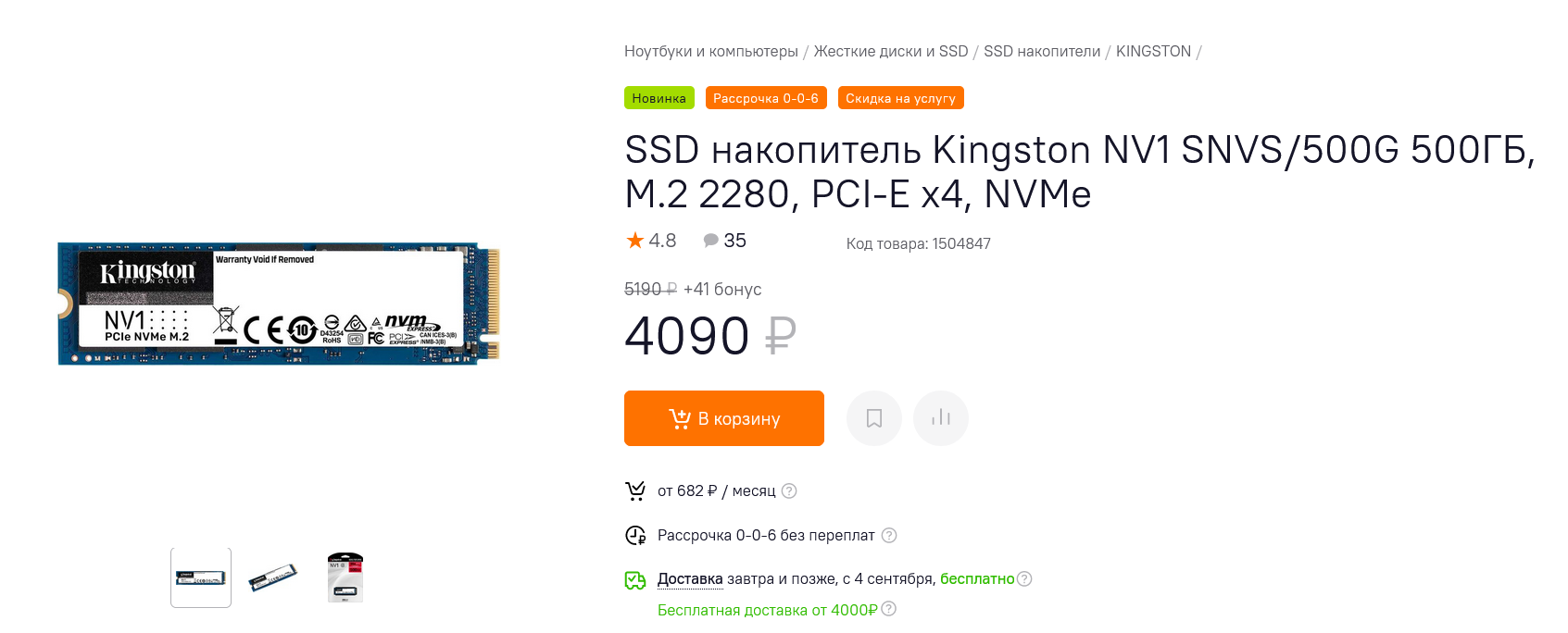 Kingston NV1 SNVS/500G - безбуферная модель на контроллере Phison PS5013-E13 и памяти 3D TLC Toshiba 96-layer, развивающая скорость чтения в 2100 МБ/сек, а записи - 1700 МБ/сек. Размер TLC буфера SSD составляет 28 ГБ, после исчерпания которого скорость снижается до 630 МБ/сек, что весьма неплохо для столь бюджетной модели. Ресурс TBW накопителя составляет 120 ТБ, а гарантия - 3 года.