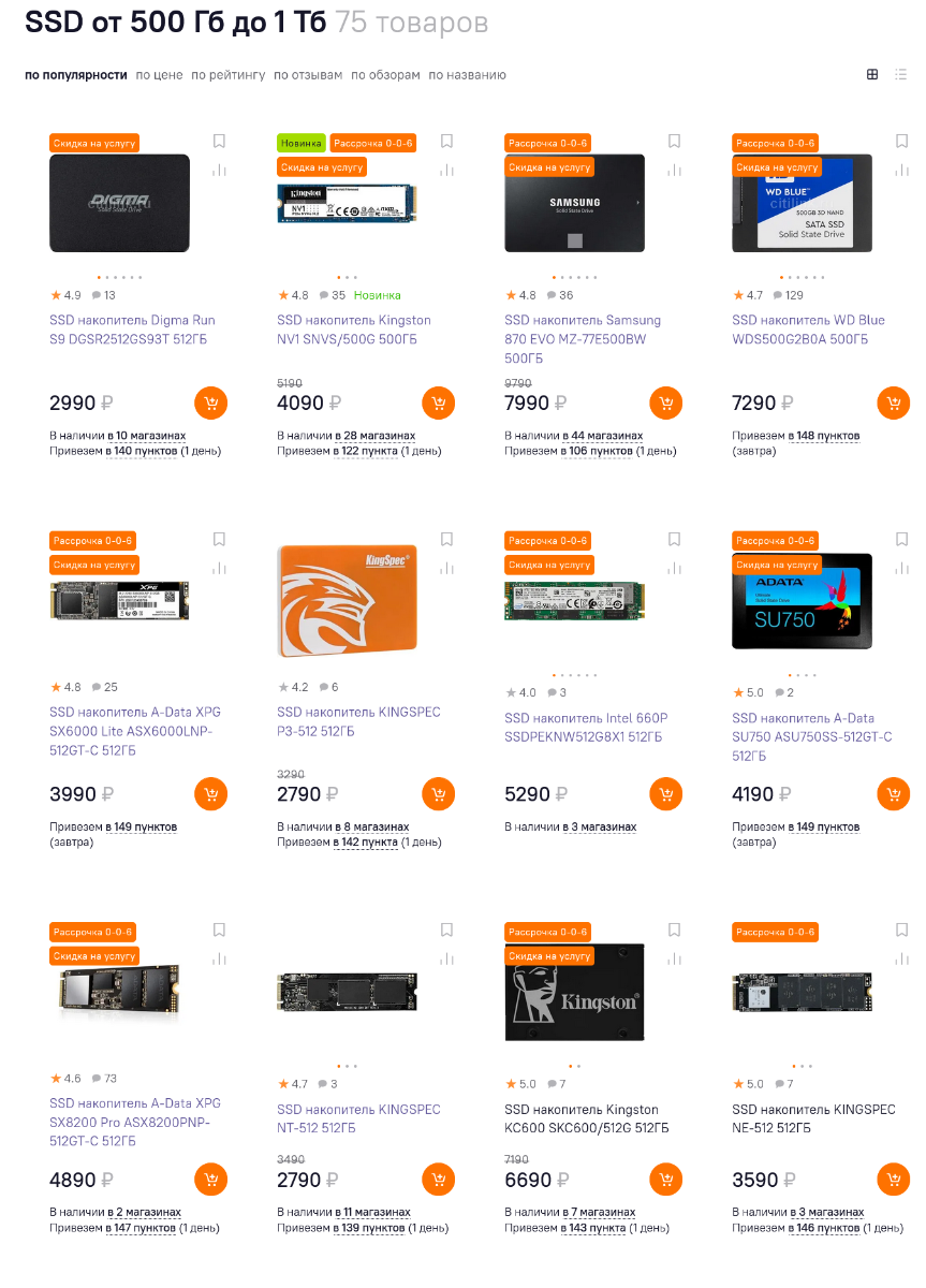 А если учесть, что часто такие накопители дополняются старыми SSD небольшого объема и жесткими дисками для файлов пользователя, то мы получаем вполне жизнеспособный вариант для современного игрового ПК, на котором не пытаются играть в 10 игр одновременно. В этом блоге я предлагаю опять отправиться в магазин Ситилинк и посмотреть на самые популярные модели SSD объемом 500 и 512 ГБ. И это будет очень интересно, ведь цены на некоторые модели различаются более, чем в два раза.