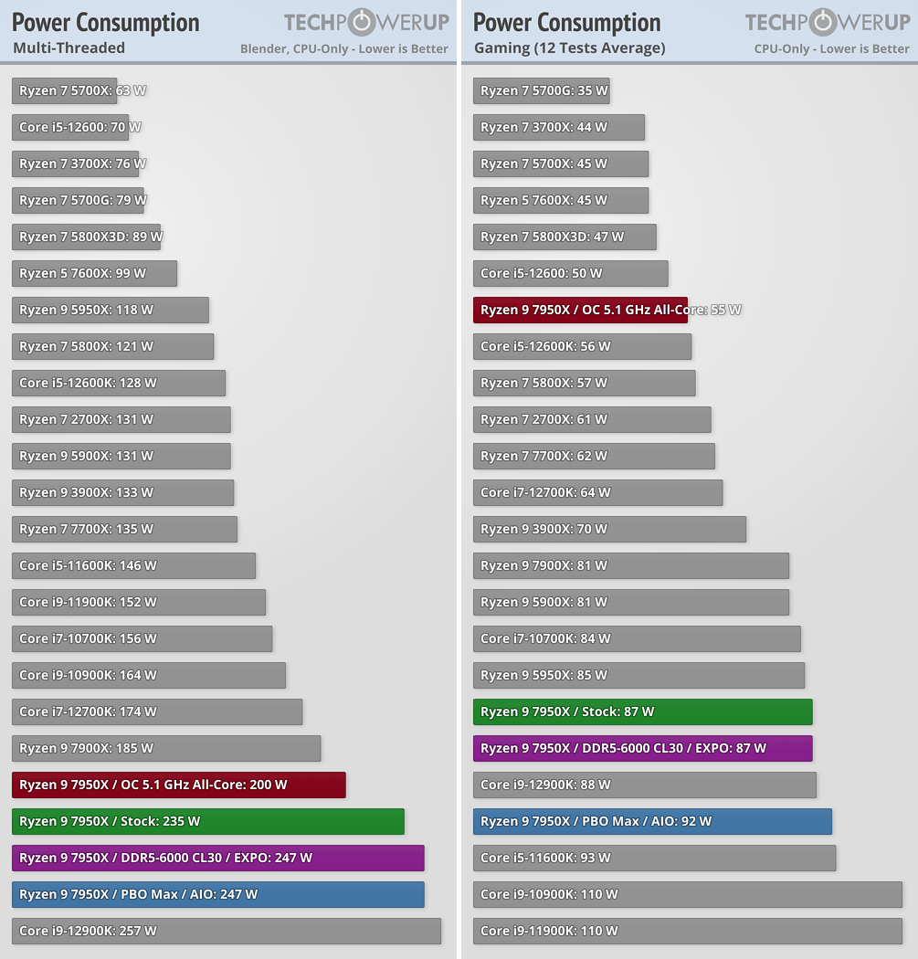 Еще одна проблема Ryzen 7000 - очень высокое энергопотребление, даже несмотря на использование 5 нм тех. процесса от TSMC. Даже шестиядерный Ryzen 5 7600X имеет Thermal Design Power (TDP) в 102 ватта, и способен потреблять до 142 ватта максимум. А топовый Ryzen 9 7950X имеет TDP в 170 ватт, а максимальное энергопотребление в 230 ватт. Это намного выше процессоров Ryzen 5000 и потребует мощного кулера и более дорогой материнской платы.