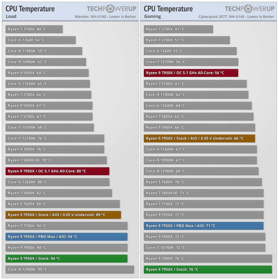 В первых тестах процессоров Ryzen 7000 сразу всплыла проблема их высокого нагрева. Даже с мощным воздушным кулером Noctua NH-U14S с шестью теплотрубками, способным отвести 162 ватта тепла, температура Ryzen 5 7600X составила 88 °C, а у Ryzen 7 7700X, Ryzen 9 7900X и Ryzen 9 7950X достигла 94 °C. Даже с использованием недешевых AIO систем водяного охлаждения температуры Ryzen 9 7900X и Ryzen 9 7950X держатся в районе 90 градусов под нагрузкой.