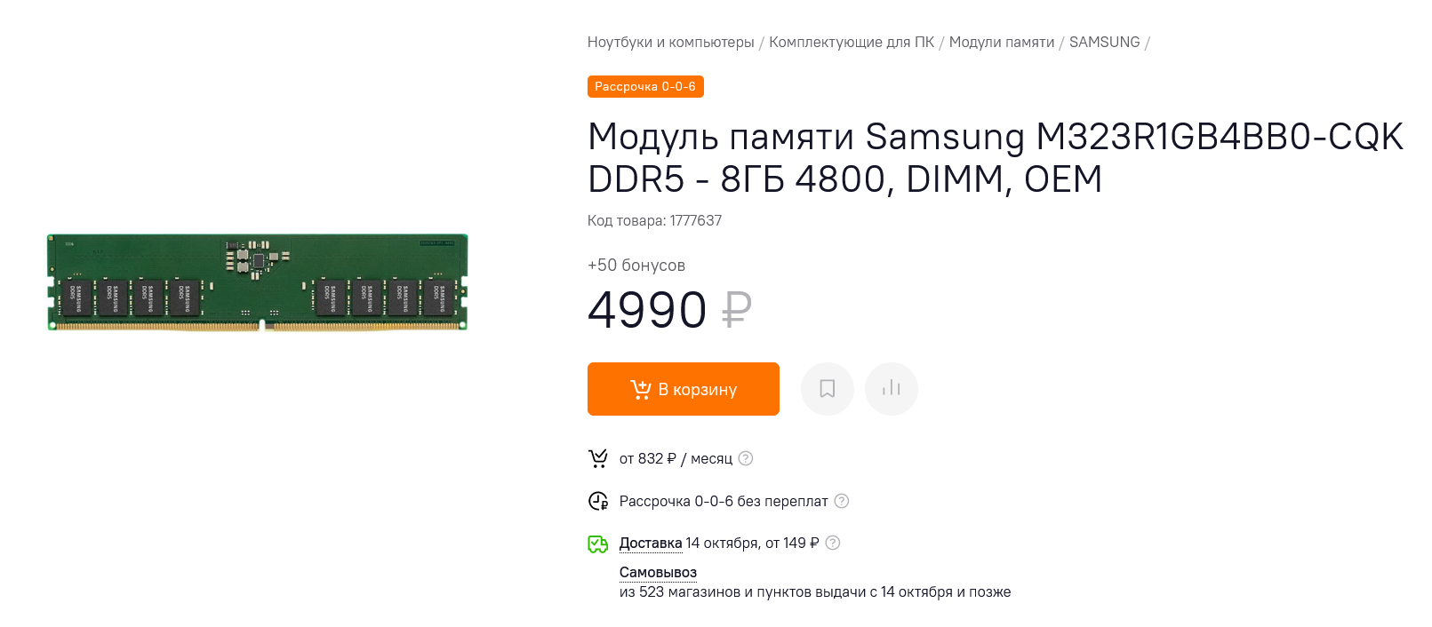 Еще одна проблема новой платформы - память DDR5, которая стоит дорого, а практического прироста производительности приносит пока мало. Например, в Ситилинке модули DDR5 объемом 8 ГБ известных брендов стартуют с цены 4990 рублей за Samsung M323R1GB4BB0-CQK.