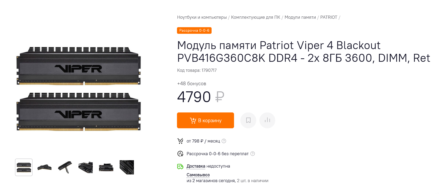 Но за эту сумму и даже дешевле можно приобрести неплохой комплект памяти DDR4 в два раза большего объема! Например, Patriot Viper 4 Blackout PVB416G360C8K с частотой 3600 МГц.